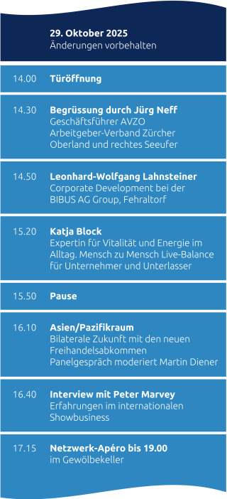 Das Wirtschaftsforum Zürichsee ist fokussiert auf die persönlichen Alltagsherausforderungen für Geschäftsleute. Das Forum ist eine Plattform mit dem Ziel, KMUs und Unternehmerinnen und Unternehmer im Bezirk Meilen und in der ganzen Region zusammenzuführen und den gegenseitigen Gedanken-Austausch zu pflegen.